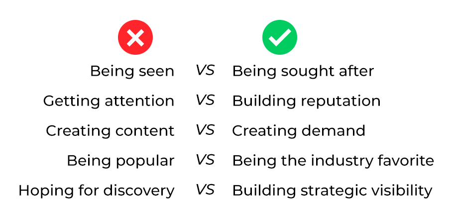 Because you’ve likely been taught the wrong approach. Most visibility strategies focus on activity (posting more, being consistent). We focus on AUTHORITY (strategic positioning, reputation building). Completely different framework, completely different results.